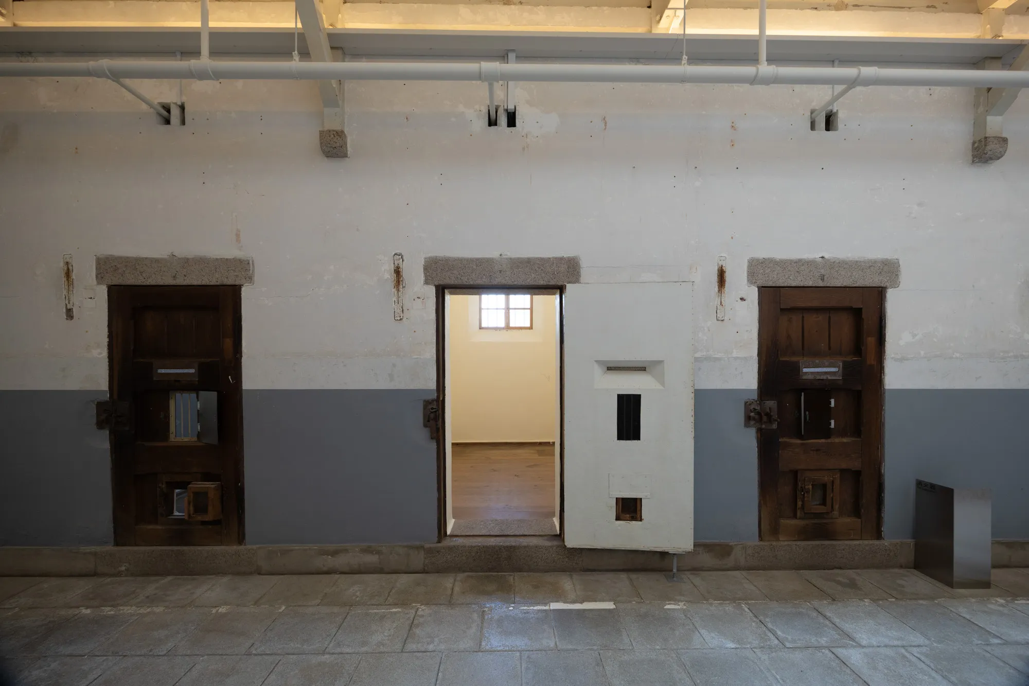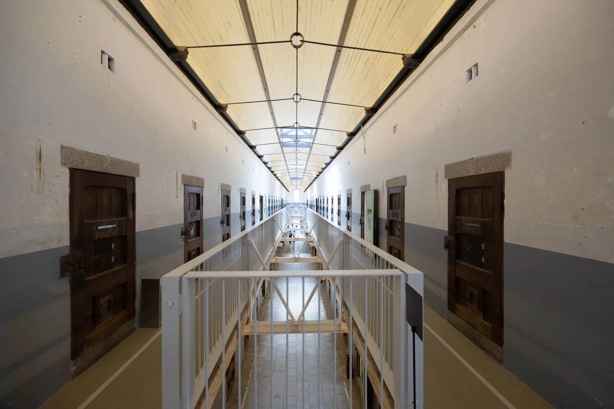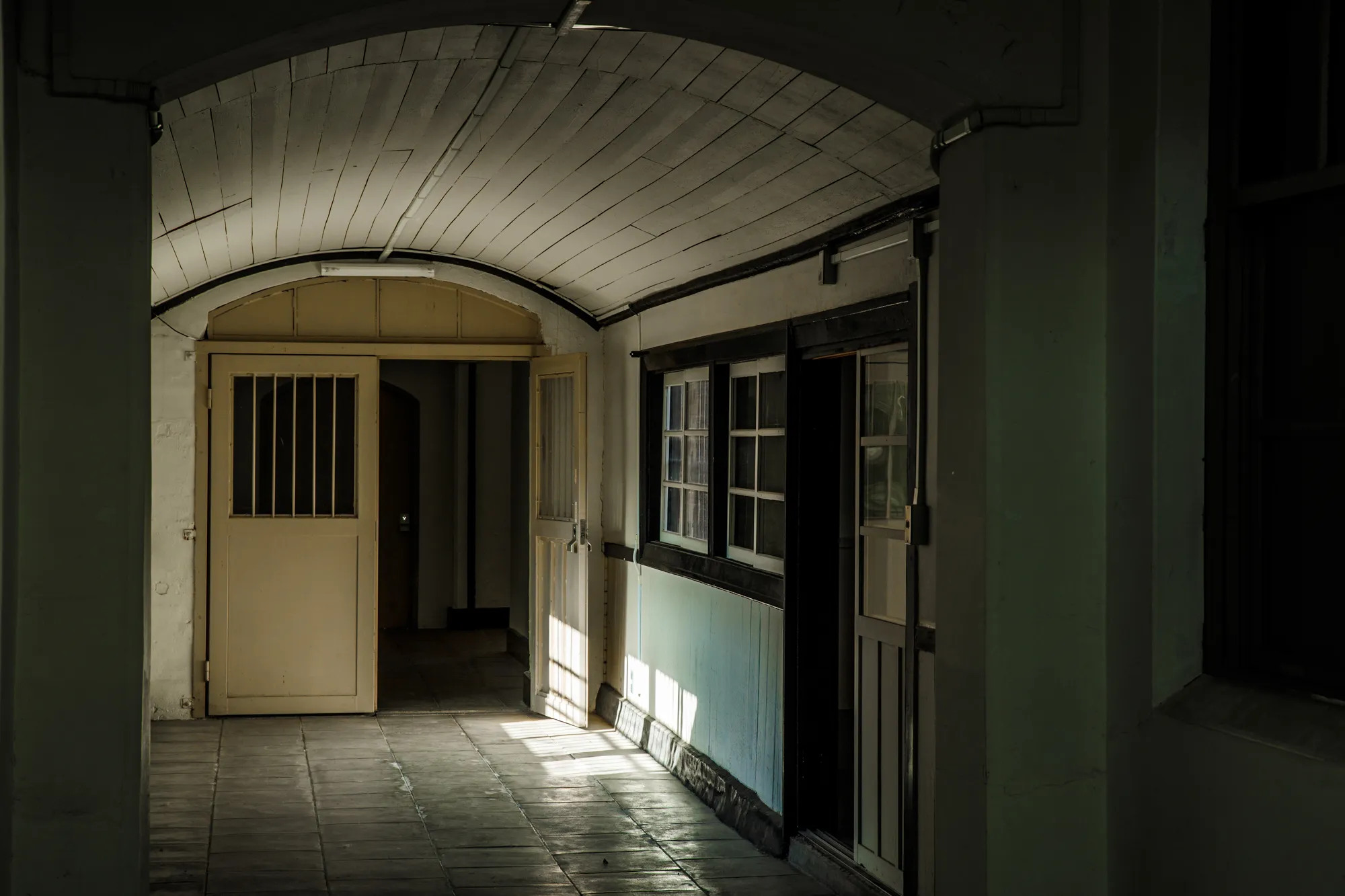 舎房の天井には逆Y字形のタイバーが規則的に配置され、整然とした印象をつくっています。2階天井の天窓から取り込んだ自然光が、吹き抜けの中央通路を経由して階下まで届く構造で、採光に強くこだわった設計です。第三寮や看守所は、旧奈良監獄当時の姿を残した「保存エリア」として公開されており、当時の空間に直接身を置くことができます。